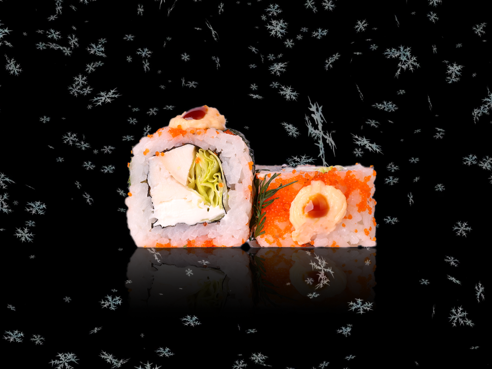 Копченая курица, сливочный сыр, айсберг, икра масаго, укроп, унаги, запеченный соус
