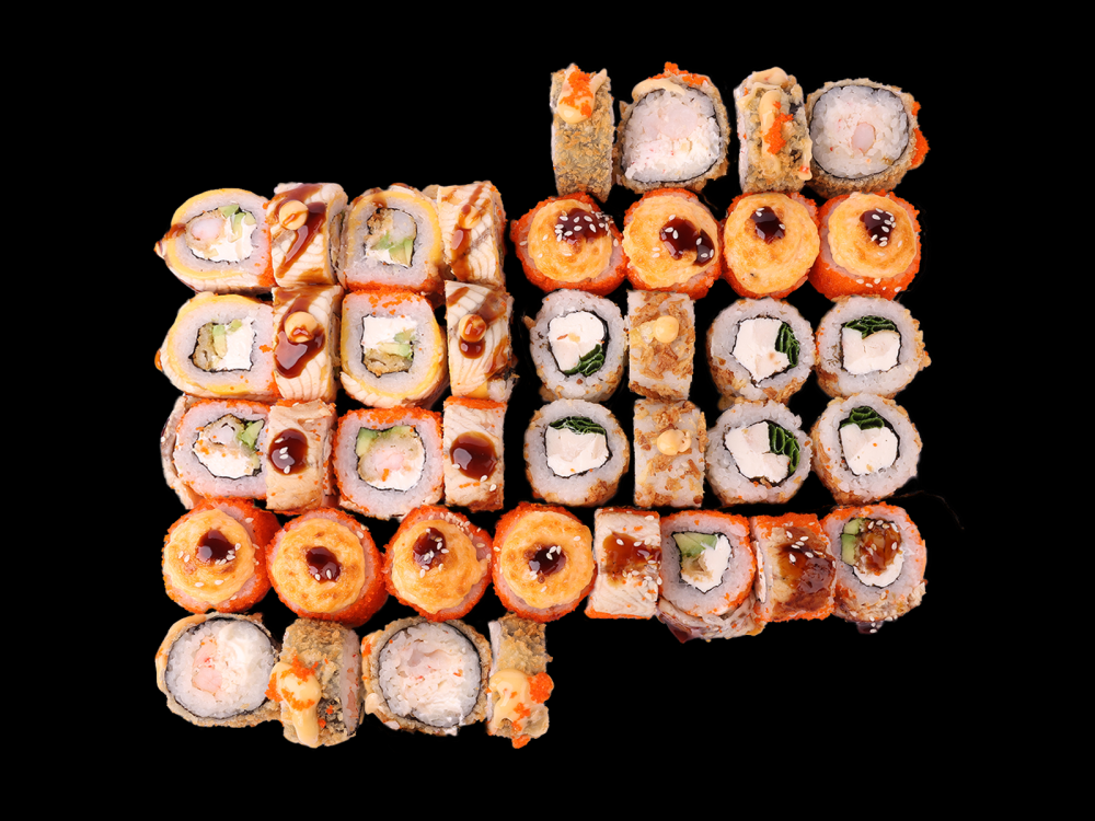 Темпурный ролл "Марсель" - 8 шт, Запеченный ролл "Император" - 8 шт, Ролл "Сан франциско" - 8 шт, Ролл "Чикен фри" - 8 шт, Ролл "VIP" - 8 шт