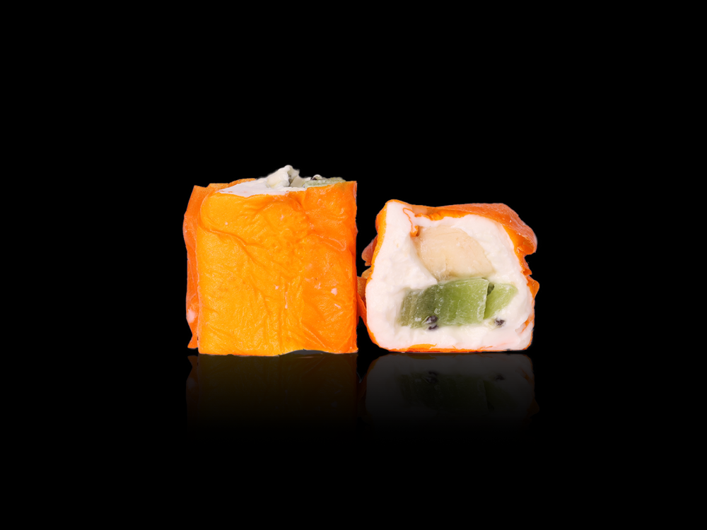 Киви, банан, сливочный сыр, клубничный топпинг, маменори, сахарная пудра, кокосовая стружка
