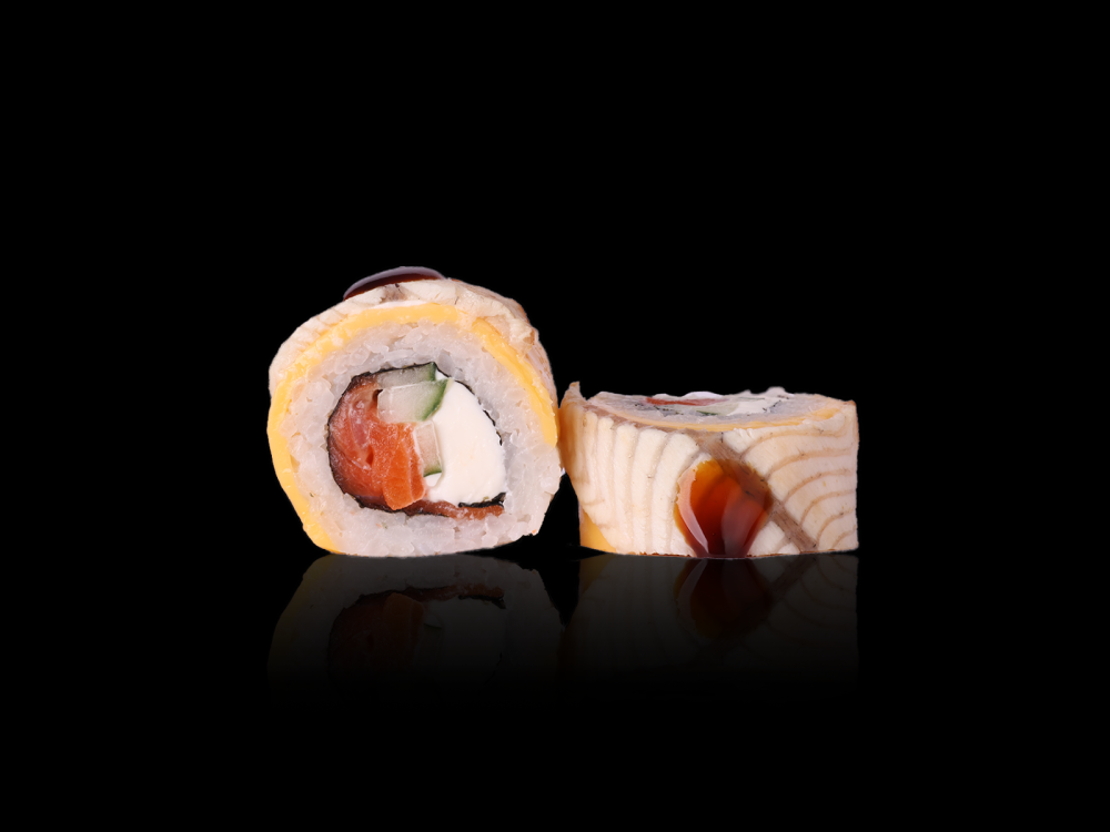 Нежный лосось, угорь, сливочный сыр, огурец, сыр чеддер, кунжут, соус унаги