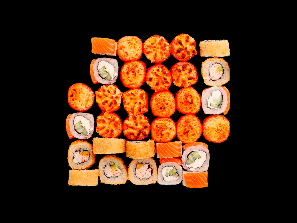 Ролл "Филадельфия классик" - 8 шт, темпурный ролл "Империя" - 8 шт, запеченный ролл "Калифорния" - 8 шт, запеченный ролл "Экшен спайси" - 8 шт